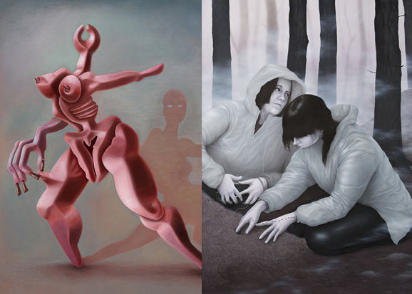 Bildnachweis: Cathrin Hoffmann, Our Bodies Know, 2025, Öl auf Leinen, 190 x 180 cm. Courtesy the artist and Public Gallery, London; Céline Ducrot, Filaments (Detail), 2024, Acryl auf MDF-Platte, 190 × 280 cm, Courtesy the artist and Kadel Willborn, Düsseldorf.