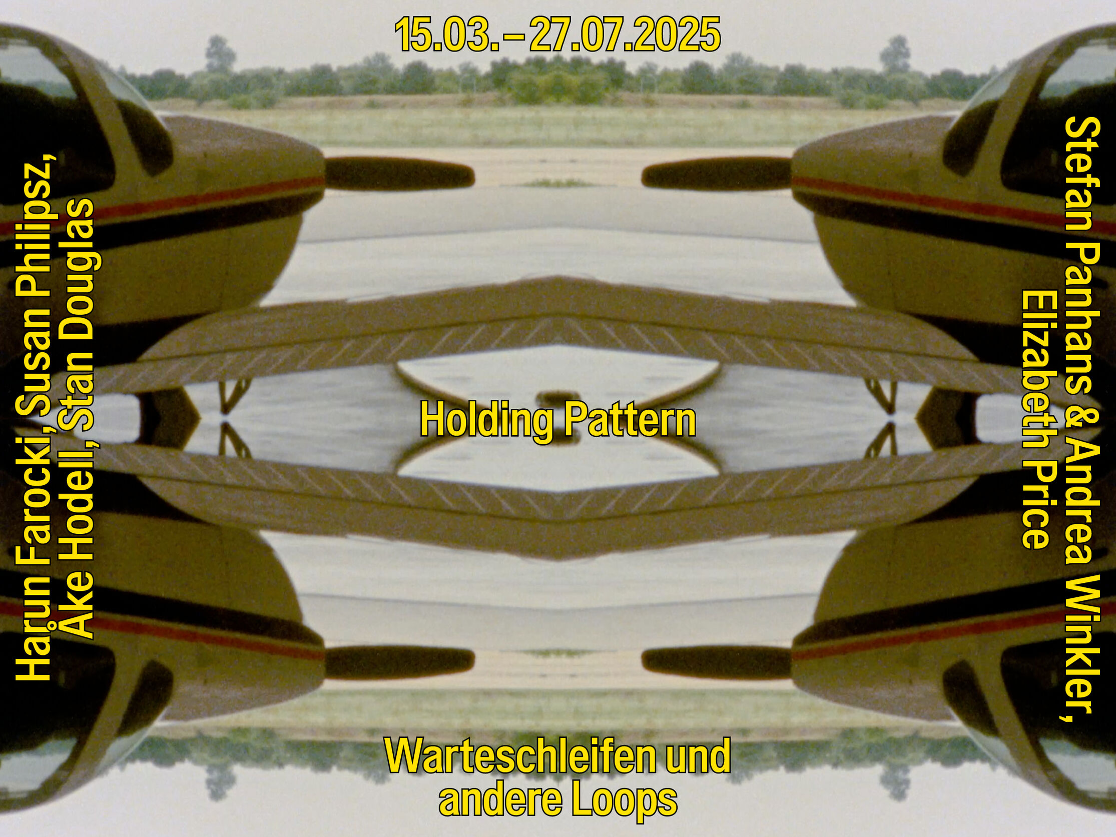 Die Ausstellung Holding Pattern – Warteschleifen und andere Loops zeigt bedeutende Installationen wie Luanda-Kinshasa (2013) des Hasselblad-Preisträgers Stan Douglas, eine sechsstündige Schleife, die eine imaginäre Jamsession in New Yorks legendärem Columbia 30th Street Studio zeigt; SLOW DANS (2019) der Turner-Preisträgerin Elizabeth Price, eine ausgeklügelte fiktive Geschichte, die Bergbau, Datenspeicherung, und die „Lehrerinnen“ eines mysteriösen Untergrundrituals miteinander verbindet sowie Prices WerkFOOTNOTES, das diese Themen aufgreift und kommentiert (2020); Harun Farockis Deep Play (2007), eine 12-Kanal-Extrapolation der physischen, sozialen, Sicherheits- und Übertragungsmuster, die ein hochkarätiges internationales Fußballspiel prägen; und Stefan Panhans und Andrea Winklers Freeroam À Rebours, Mod#I.1 – Installation Version All Choices All Endings II (2025), das zwischen menschlichen Tänzern und digitalen Avataren hin- und herschaltet, während es die Schleifen und Pannen des Grand Theft Auto-Universums untersucht. Zu sehen ist auch die Arbeit Ambient Air (2021) der Turner-Preisträgerin Susan Philipsz, in der sie ein buchstäbliches Warteschleifenmuster in den Berliner Himmel zeichnet, während sie Brian Enos „Music for Airports“ in dem Cockpit eines Kleinflugzeugs summt und ihre Stimme über den Funkturm an die Beschallungsanlage des Flughafens Tegel übertragen wird. Auch Åke Hodells bahnbrechendes Werk igevär (1963, dt.: „zu den Waffen“) wird in der Ausstellung gezeigt, in dem das titelgebende militärische Befehlswort, das Soldaten in Formation versammelt, durch Wiederholung entschlüsselt wird, um andere, emanzipatorischere Aufrufe zu den Waffen anzudeuten.
