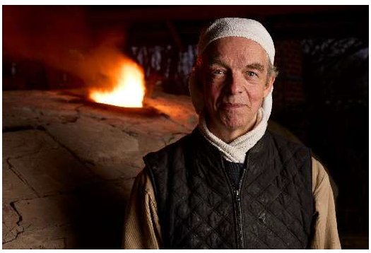 Bildnachweis: Jan Kollwitz vor dem brennenden Anagama-Ofen, Dezember 2024, Foto: Götz Wrage
