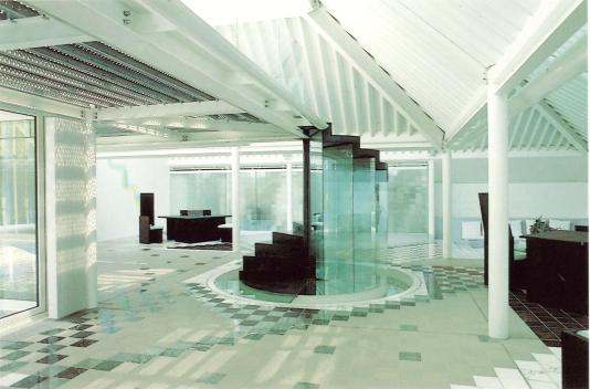 Eine Wassertreppe schafft eine optische Verbindung vom Mack-Raum zum 156 qm großen gläsernen Atrium. Dort treffen Wasser und weiße Marmorkiesel auf eine beeindruckende Glasskulptur, die mit ihren Dimensionen von 4 x 4 x 4,5 Metern und einem Gewicht von 4 Tonnen beeindruckt. Diese Skulptur besteht aus Spezialglas und schwebt nahezu schwerelos über der Wasserfläche im Atrium.