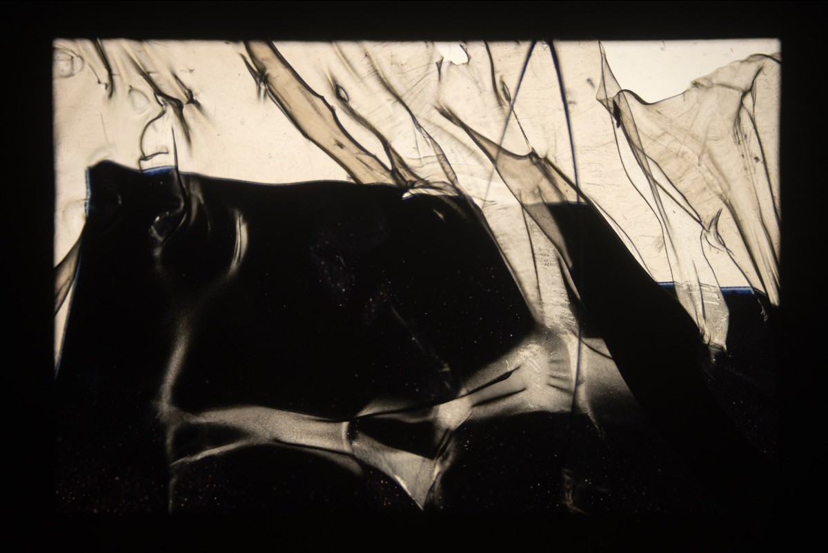 Einen Schwerpunkt der Ausstellung im Haus am Waldsee bilden Akdogans seit 2010 entstehende Carousel-Arbeiten: Dünne Schichten aus Farbfiltern, Mylar und transparenten Resten werden in 35-mm-Dias gefasst und rotieren im Licht des Projektors. Die entstehenden Projektionen sind keine fotografischen Bilder, sondern materielle Überlagerungen, Ausschnitte und Fragmente, die die Gleichförmigkeit industrieller Oberflächen modulieren. Mit jeder Drehung verändern sich Tonlagen: Farbtöne kippen, Linien und Strukturen finden neue Ausrichtungen, vertraute Texturen lösen sich in andere Rhythmen auf. Das Gewohnte wird rätselhaft, bleibt jedoch an seine materielle Herkunft gebunden. So entsteht ein Feld von Übergängen, in dem sich Material und Wahrnehmung neu zueinander verhalten.