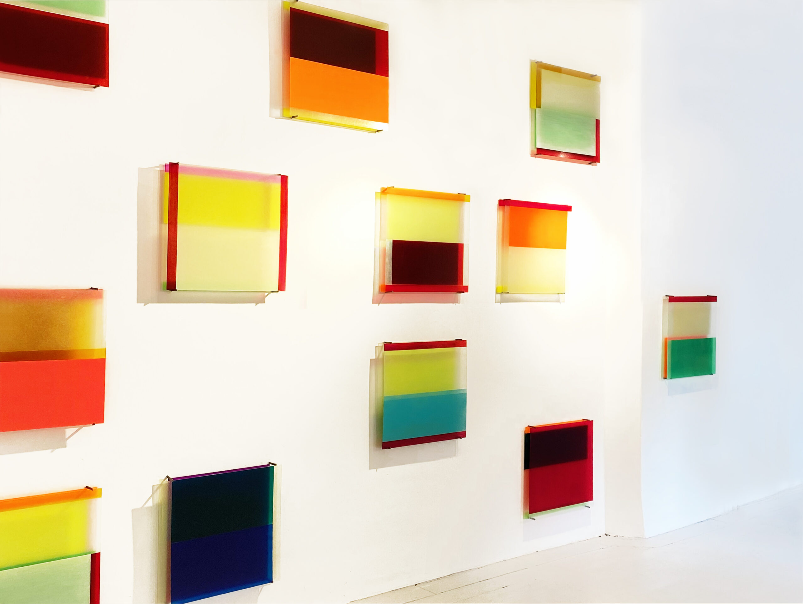 Bildnachweis: „Transluzide / Farbstücke“, verschiedene Lacke auf 2 Polyesterplatten, je 50 x 50 x 5 cm, Foto: ©Margareta Hesse