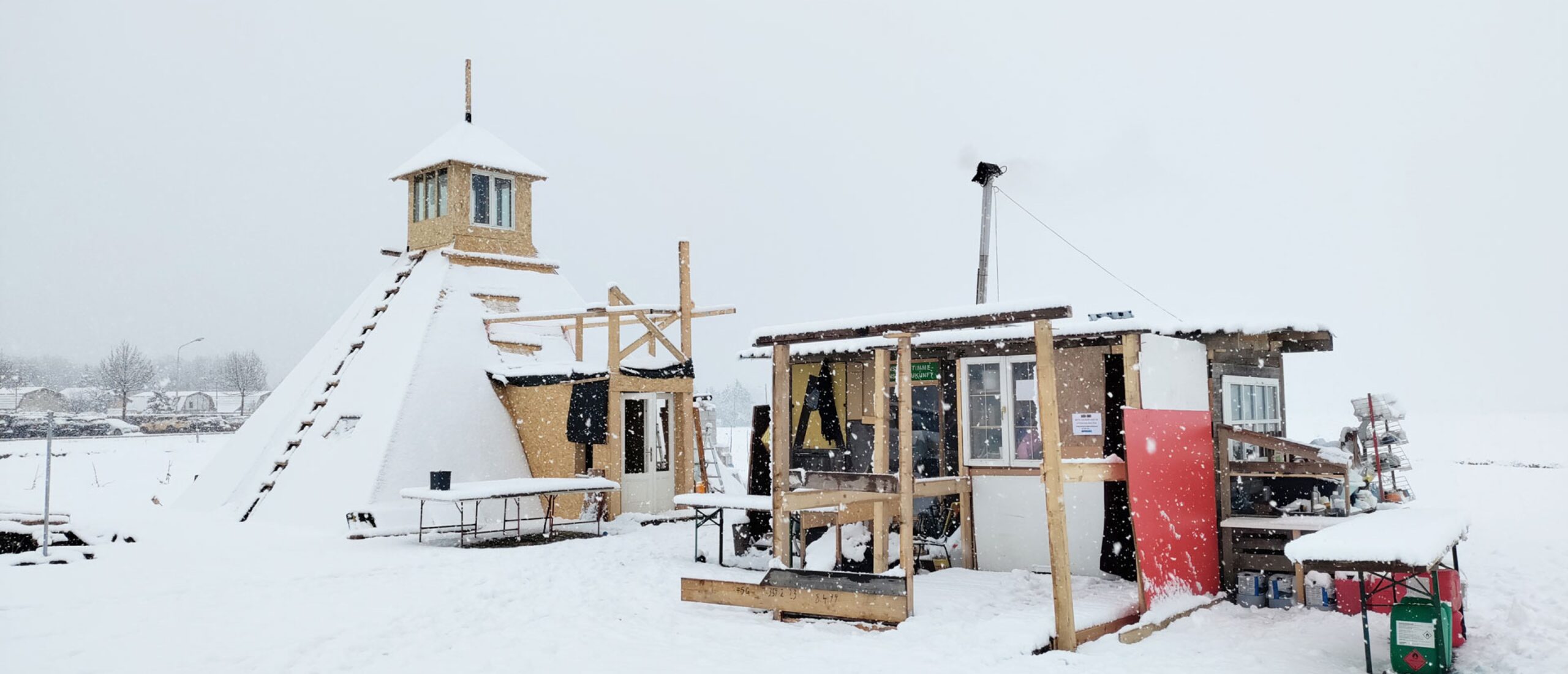 Detailreiche Modelle, gebaut an der Technischen Universität München und der Hochschule für Technik Stuttgart (Prof. Andreas Kretzer), zeigen ausgewählte Protestcamps von der Resurrection City in Washington DC von 1968 bis zur Wiener „LobauBleibt!“-Bewegung von 2021/2022. Vierzig „Bodenstrukturen“ aus Lützerath, zumeist Pfahlbauten, wurden von Rokas Wille (Staatliche Hochschule für Gestaltung Karlsruhe) mit Fotopapiermodellen dokumentiert. Der Regisseur Oliver Hardt entwickelte speziell für die Ausstellung eine Filminstallation. Gemeinsam mit Aktivist*innen konnte eine Hängebrücke aus dem Hambacher Wald übernommen werden. Auch ein 1:10-Hängemodell des Barrios Beechtown, eine Leihgabe des Künstlers Stephan Mörsch, zeigt diese Waldbesetzung. Die „Lobau-Bleibt!“-Proteste werden zusätzlich durch zwei Filme der Künstler Oliver Ressler und Christoph Schwarz dokumentiert und die österreichische Gruppe von Extinction Rebellion stellte eine ihrer Tensegrity-Strukturen zur Verfügung. Die Ausstellungsarchitektur wurde von Something Fantastic entwickelt.
