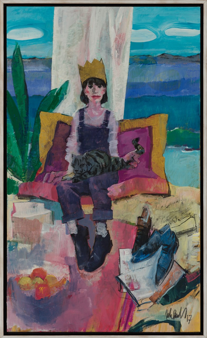 Bildnachweis: Roland Schauls, Kronjuwelen unter Aufsicht, 2017/23, Acryl und Kohle auf Leinwand, 176 x 105 cm.